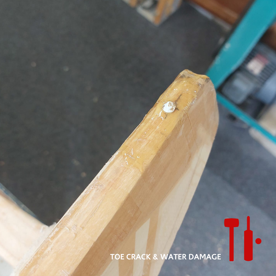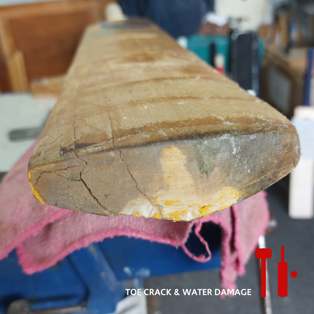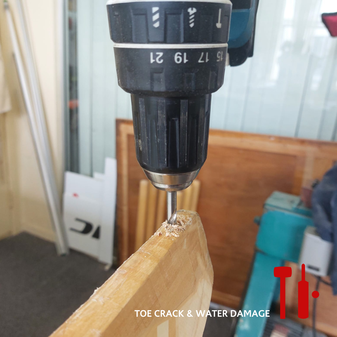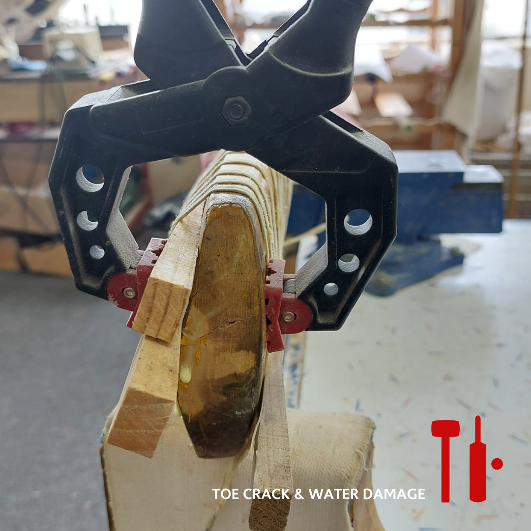 Fear not however, as toe cracks are often repairable! Our workshops in Christchurch and Mt Eden are set up to repair most toe damage. Toe repairs involve filling the cracks with glue and clamping the toe so the wood fibres seal together. Sometimes we may need to insert a wedge into the toe to rebuild its shape, insert a peg to hold it in place, or replace a section of the toe with a wood insert.