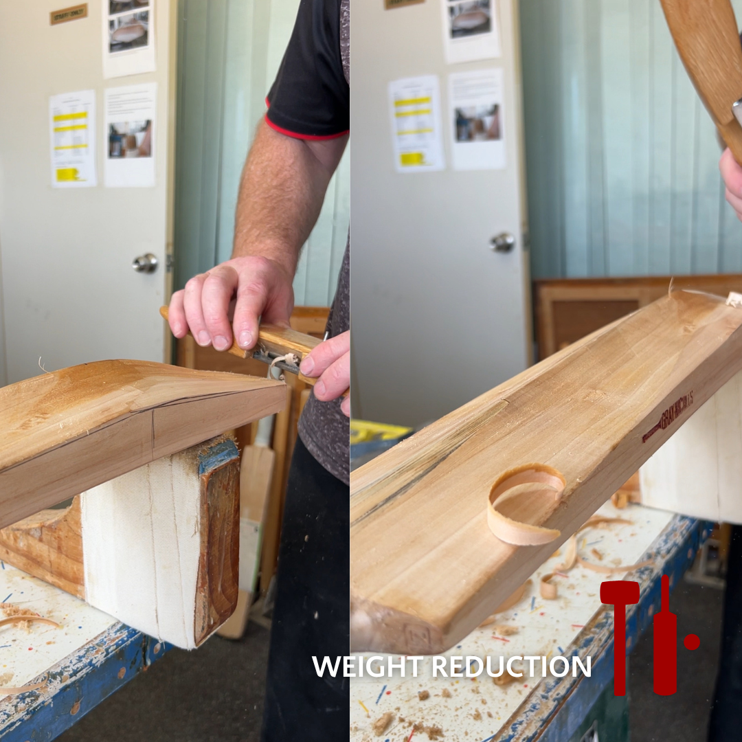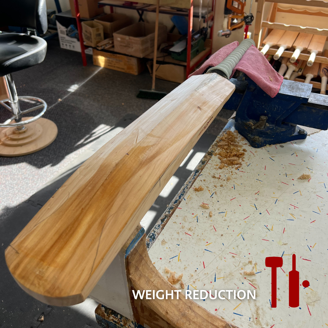 A weight reduction involves removing wood from the back of the bat to bring the overall weight of the bat down.
